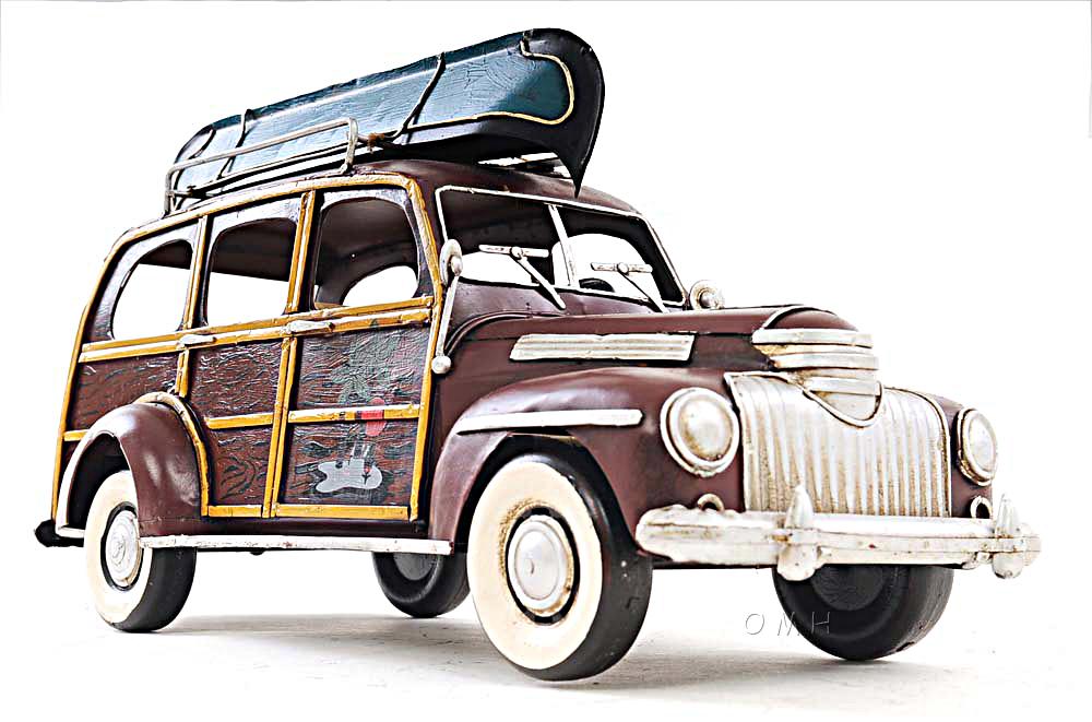Travel back in time with this vintage 1947 Chevrolet Suburban model. A classic American wagon made just after World War II. Made of metal, it features many intricate parts such as fenders, wheels, hood, grills, roof rack, and canoes with paddles. A perfect gift to display in your home or office! • 100% iron frame • Scale 1:14 • Metal wheels • Wheels roll • Decaled insignia • Includes seat and steering wheel • Exterior details such as the canoe equipment are securely welded on