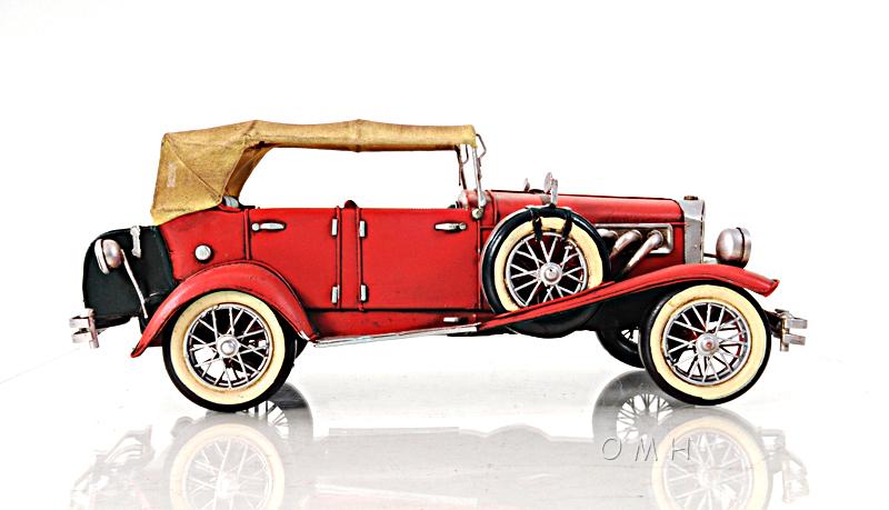 Swanky and stylish, this red 1933 Duesenberg J model was handcrafted of iron. Scaled to size 1:12, this Duesenberg J is an exact replica of the original 1933 model. Featuring classic wheels with spokes, this signature model Duesenberg rolls just like the actual vehicle. Complete with hood ornament and convertible top, the signature 1933 Duesenberg Model J is an admirable piece of beauty that is a must-have for any collector or enthusiast! • 100% iron frame • Metal wheels • Wheels roll • Canvas soft-top • Includes seats, steering wheel, and small details on dash • Exterior details such as the spare wheels are securely welded on