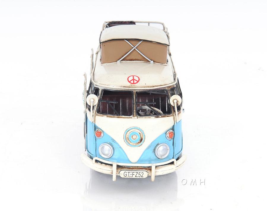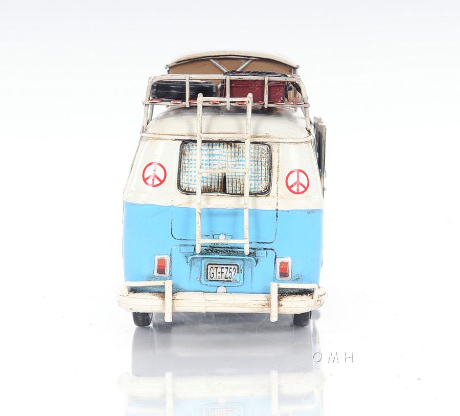 This little cute camp bus is the accurate scale replica of the famous car Volkswagen split windshield Kombis which were built between 1950 and 1967. This automobile model is 100% iron frame with metal, rolling wheels. The decal insignia and painted details give more of an authentic look. The model has seats as well as a steering wheel and minor details on the dash. Other interior details include camping gear and a table in the rear. The exterior details, such as the spare wheel, are securely welded on. When shipped, the item is packaged with foam inserts banded to pieces of cardboard to keep them held sturdily in place. • 100% iron frame • Metal wheels • Wheels roll • Painted and decaled insignia • Includes details such as seats, steering wheel, and gas pedal. • Exterior details are securely welded on • Scale 1:15