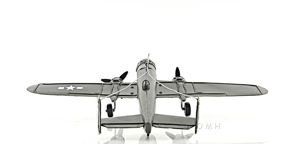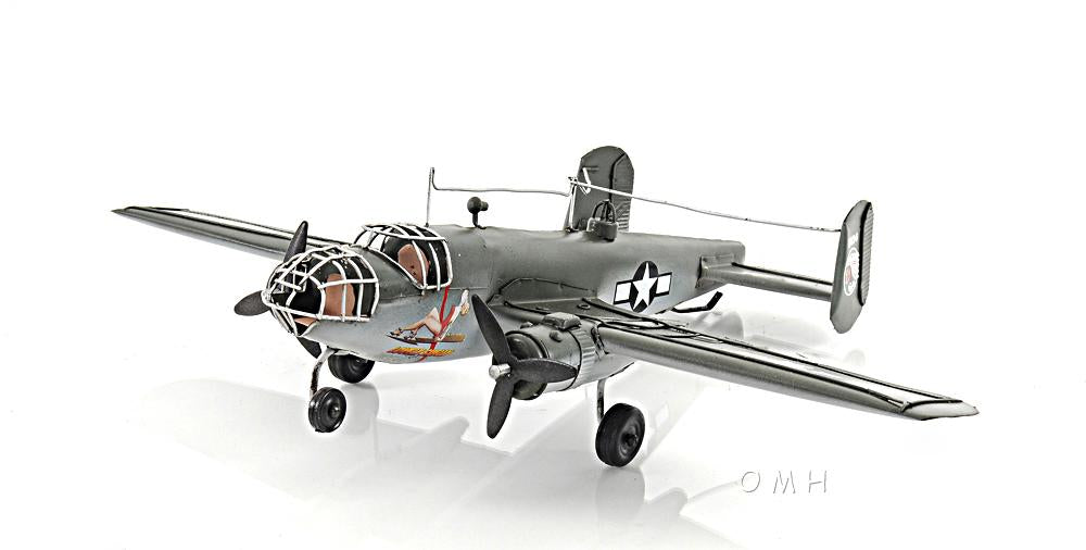 The North American B-25 Mitchell Bomber is an American twin-engine, medium bomber manufactured by North American Aviation. This replica model is handcrafted in iron frame. This B-25 Mitchell Bomber model comes with fine details such as rotor blades, wings, cockpit, and landing wheels. They are beautifully painted with the authentic WWII paint and symbols. A must have for the collector and enthusiast! • 100% iron frame • Metal wheels • Metal propeller • Wheels roll • Propellers spin • Decaled insignia