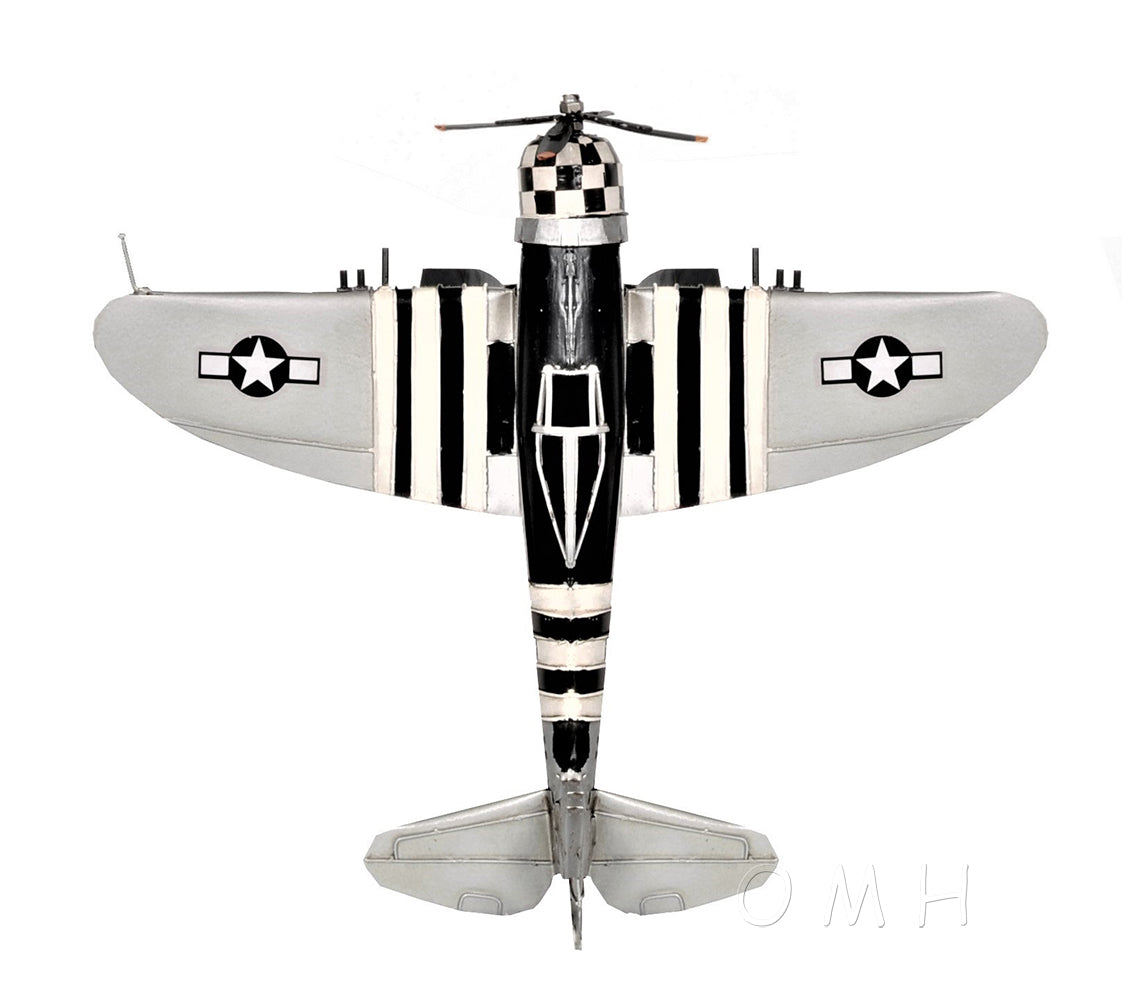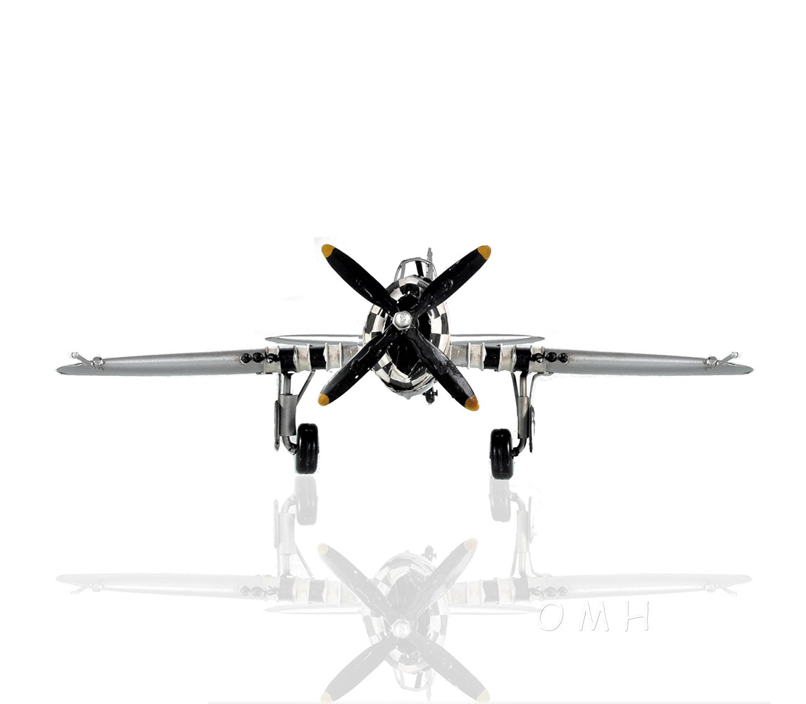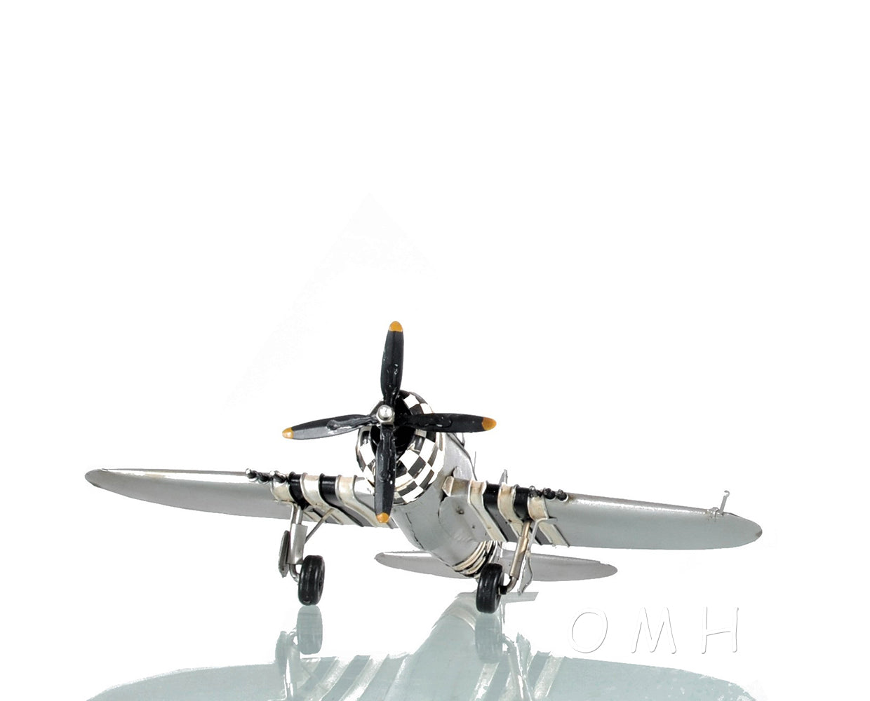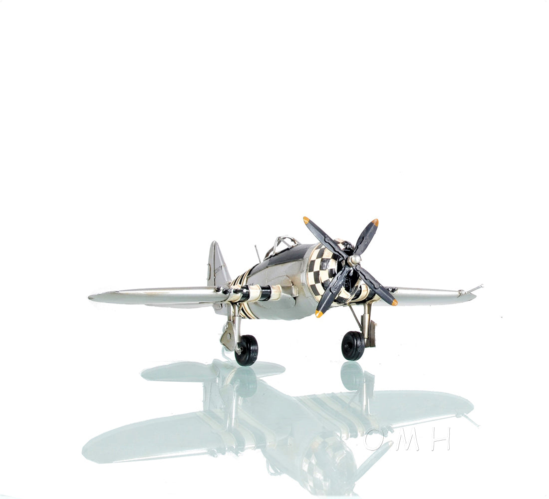 The P-47 thunderbolt was the dominant fighter in the US army's air corp and wasn't replaced in that role until the P-51 entered service. It flew alongside the P-38 lighting in providing fighter escort for heavy bombers of Germany. The model features a rotating prop, mock wing guns, and a checkered engine cowling a popular design choice for the aircraft. It's made of tin, its size makes it perfect for sitting on a bookshelf, and is ideal for countertop decor.