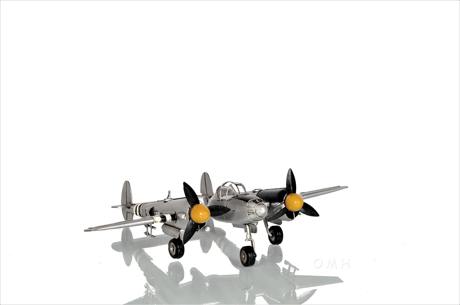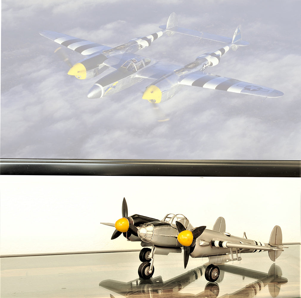 The P-38 lighting is a twin-engine fighter designed by Lockheed for the US army air corp armed with 50 caliber machine guns and a cannon all within the nose of aircraft allowing for ease of aiming and to remove the need for gun convergence. Its large size allowed it to escort bombers deeper into Germany and for it to perform long-range recon missions. This model features nose mounted guns, twin rotating props, and tricycle rotating landing gears. The plane sizes make it perfect for decorating a shelf, placed in a small display case next to a larger centerpiece, or by a bedside for those who enjoy the history held in the lighting through its years of service.