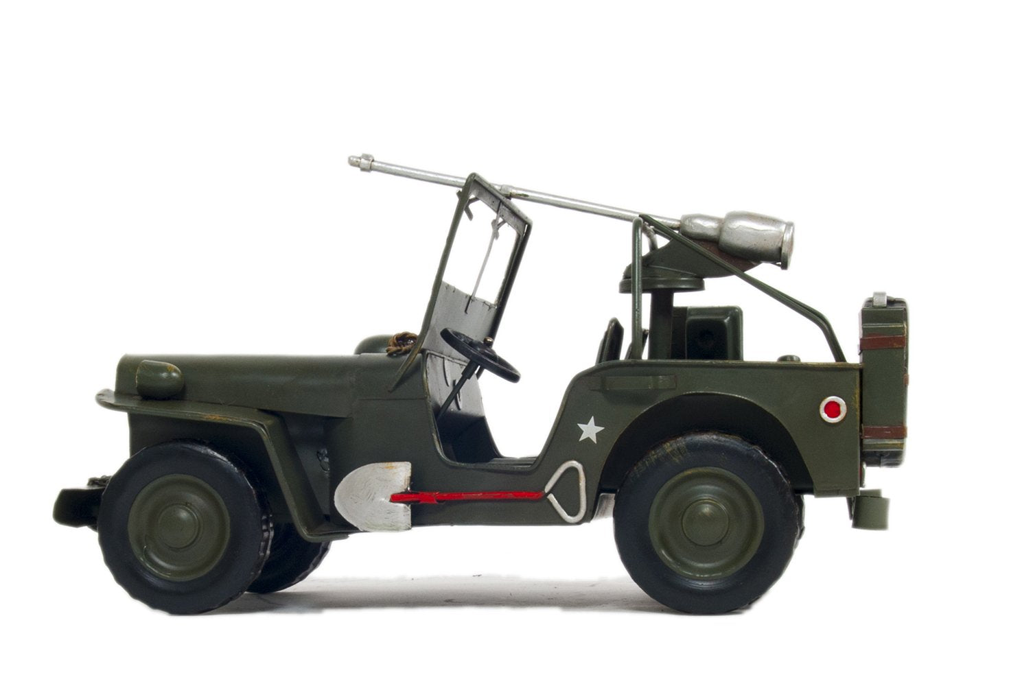 From 1941 to 1945 Willys produced the MB model, the original go-anywhere, do-anything vehicle, which came to be known by its nickname, "Jeep". Made famous during WWII, Willys produced over 300,000 MB vehicles. Our Willys MB Jeep model is handmade out of tin. It features many intricate exterior parts such as fenders, mounted machine guns, wheels, grills, headlights, shovel, chain, spare tires, storage compartment, and a star symbol decal hood. For the interior, it includes seats, steering wheel, stick shift, and small details on dash. Display this model anywhere you like and it will surely make a conversational piece. It's truly a must-have for the collector and enthusiast!