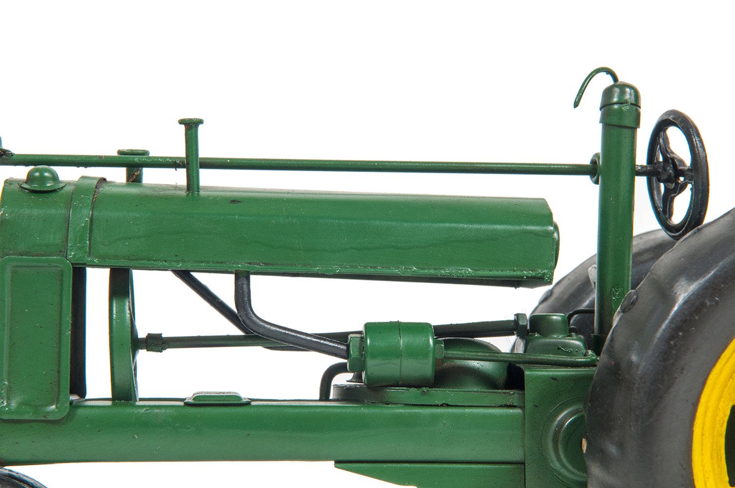 The Model B was introduced in 1935 as a medium-sized tractor, capable of pulling a plow with two twelve-inch bottoms. As standard equipment, it had steel wheels; four speeds forward and one reverse, and had a belt pulley and a PTO. There are no grills or other sheet metal covering the radiator. These tractors are extremely desirable. The 1935 Model B's are called "Brass Tag" because they have a brass serial number plate. All of the John Deere two-cylinder tractors at this time were designed to run on "tractor fuel" or "distillate". Our 1935 John Deere Model B Tractor model is beautifully handmade out of tin. It features many intricate details such as 4 rolling wheels, seat, axles, shaft, steering post, frame, steering wheel, and more. Proudly display this model anywhere you like and it will surely make a conversational piece. A must-have for the collector and enthusiast!
