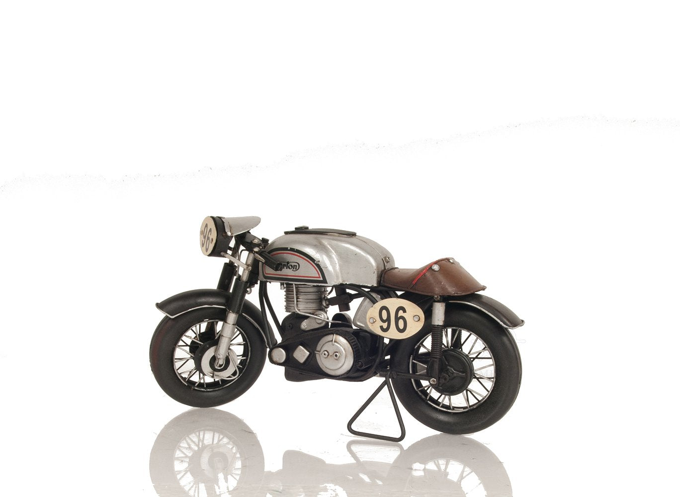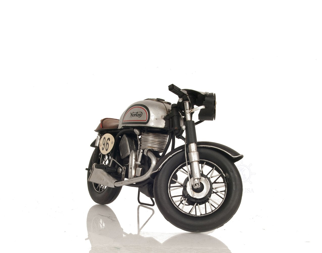 The Norton Manx or Manx Norton is a British racing motorcycle that was made from 1947 to 1962 by Norton Motors Ltd. It had contested every Isle of Man TT race from the inaugural 1907 event through into the 1970s, a feat unrivaled by any other manufacturer, and the development and honing of the Manx racing motorcycle was another step in this racing achievement. Our 1952 Norton Manx model is handcrafted of tin. It is painted silver and has a scale of 1:8. It features intricate details such as mesh wheels, 500cc engine, seat, lightweight frame, exhaust, front and side license plate with number 96, fenders, and a brake lever. Bring home and display this iconic British bike from the height of Norton’s dominance of open road-racing in the 1950s. Beautiful and brutal, the Norton Manx is a true motorcycling legend. A must-have for the collector and enthusiast!