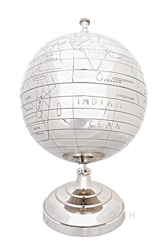 Travel the world in the comfort of your home or office with this 13” aluminum globe. The semi-meridian holds the globe atop the aluminum base. The primitive engraved continents and names are inspired by the discovery of land in the early 1800’s. • Made out of brass with a shiny nickel finish