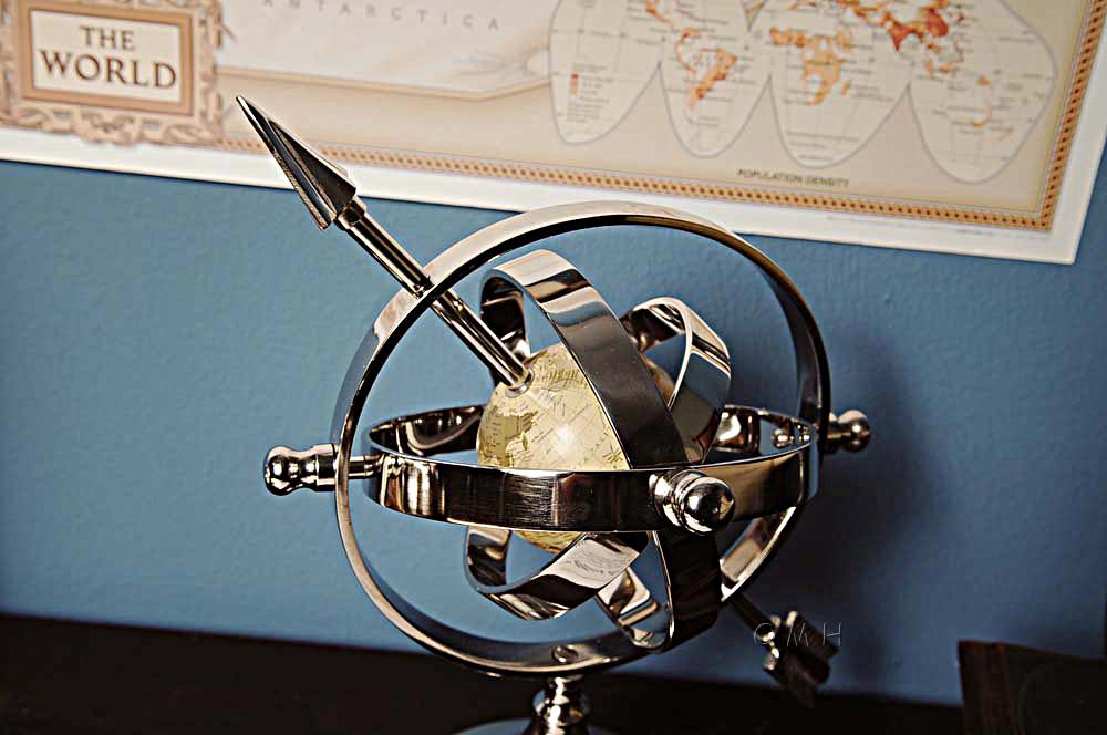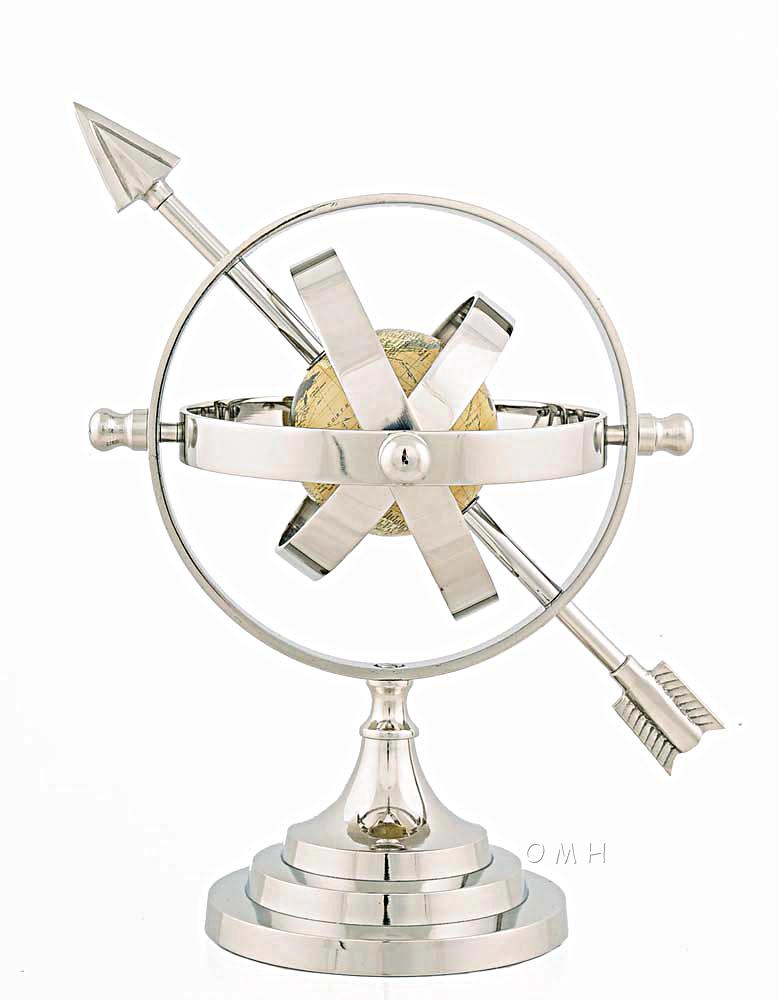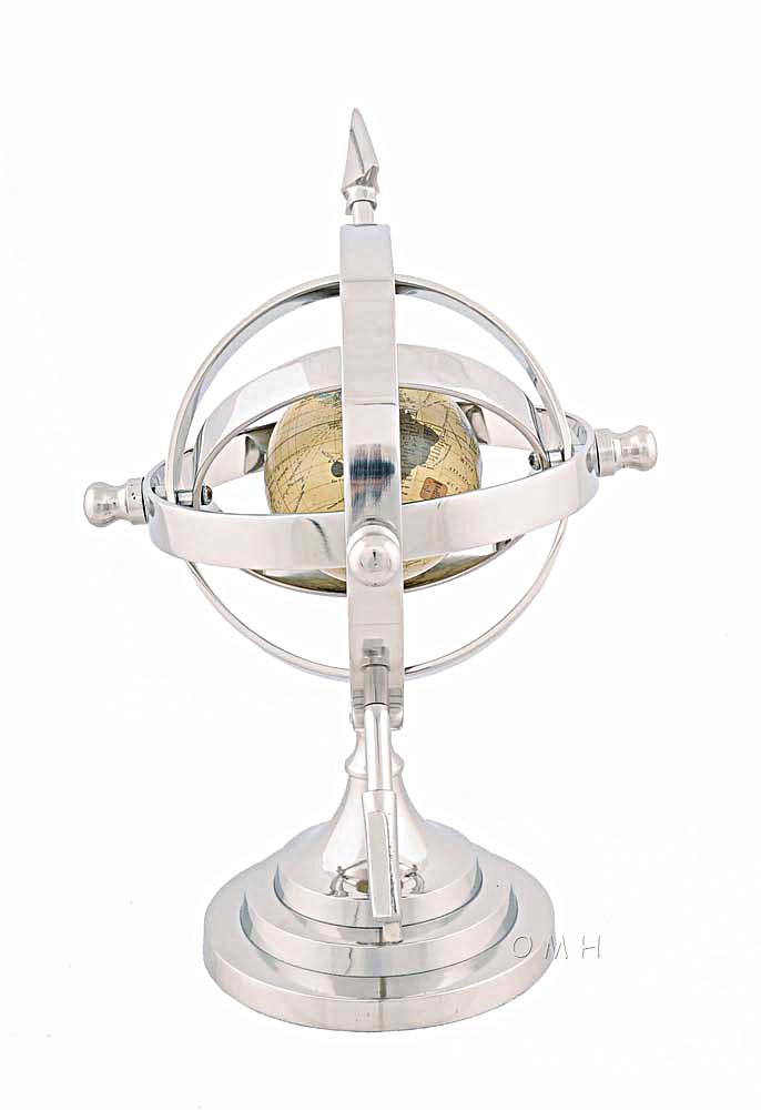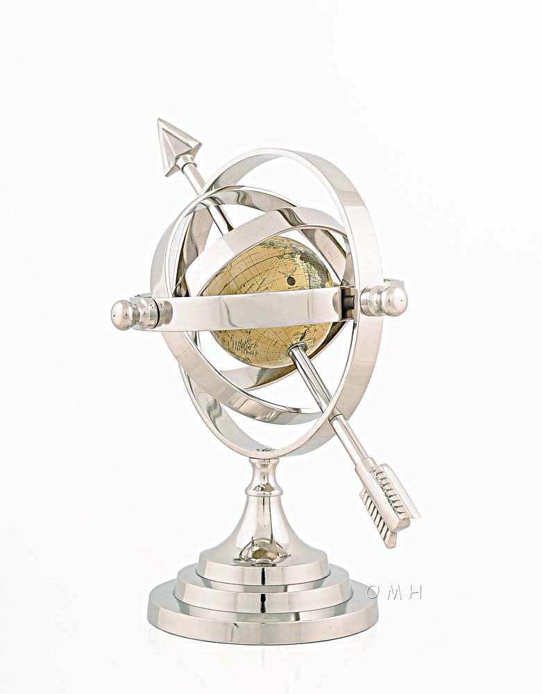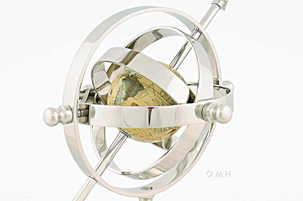 The armillary sphere has been around for centuries and represents the lines of celestial longitude and latitude. Every daydreaming aviator needs an armillary sphere in their home to help map the stars. This silver armillary carries a globe within and rotates at the sides. • Made out of aluminum with a shiny nickel finish • Globe spins at the North and South Pole • Inner bands are moveable
