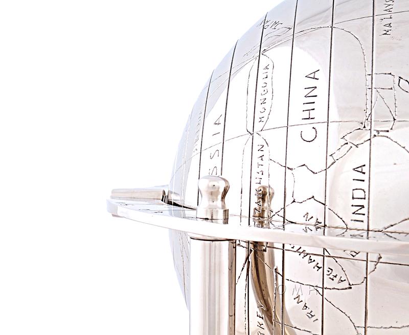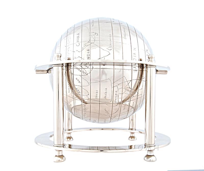 A premature indigenous perspective of the world is etched on to this aluminum globe, bringing about feelings of an earlier time. The globe is faced downwards so you can look at it from above as it spins between the sides of a four-legged stand. • Made out of aluminum with a shiny nickel finish • Globe spins at the North and South Pole