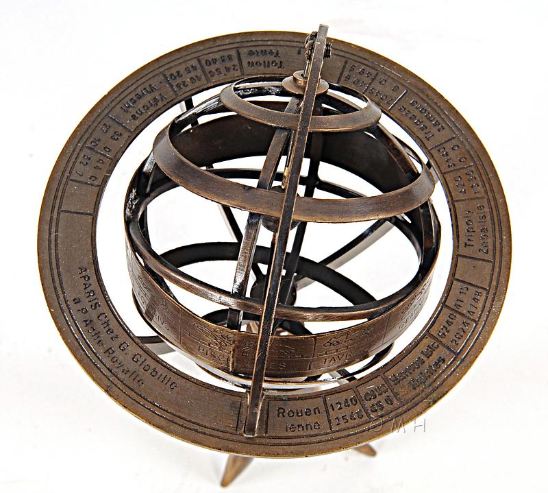 With earth at the center, an armillary globe was believed to show how the stars move around the Earth. The four brackets are held by a wooden stand which carries several bronze hoops to align the sundial and zodiac signs and show those of that time about the path of the planets. • Armillary made out of brass while the stand is made out of buffalo horn • Armillary interior spins
