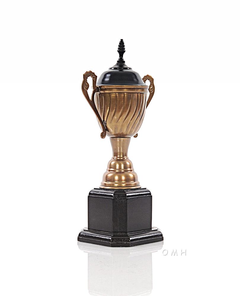 A brass antique trophy on a wooden base makes everyone feel like a winner. The beautiful adorned handles, which are welded on, and the size make for a great centerpiece or other home décor. The cap is removable and can do anything from hold flowers to hide keys! • Cap detaches • Trophy and cap made out of aluminum with a bronze finish • Base made out of dark wood with a felt lining on the bottom • Trophy is hollow