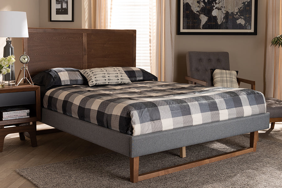 Baxton Studio Allegra Mid-Century Modern Dark Grey Fabric Upholstered and Ash Walnut Brown Finished Wood Queen Size Platform Bed