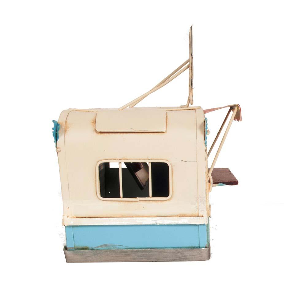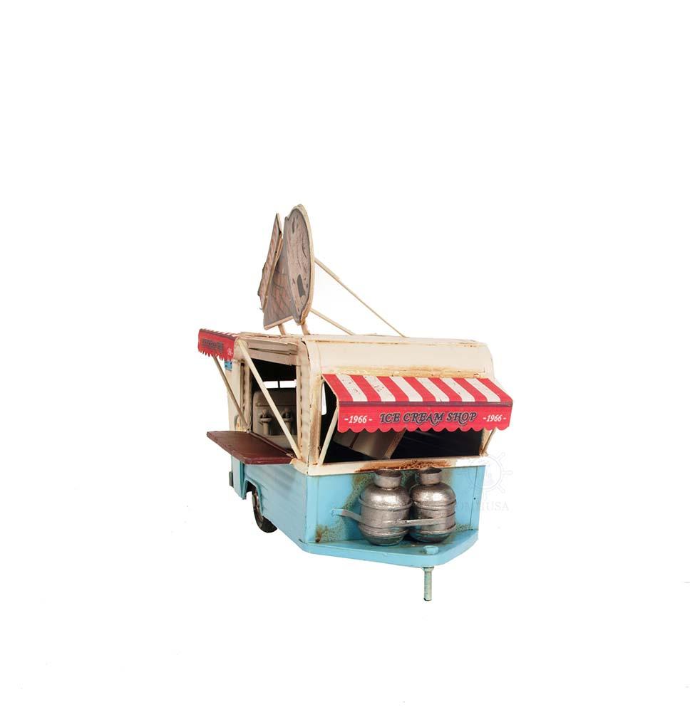 Ding Ding Ding Can't you hear it coming Ding Ding Ding Bringing its frozen treats... This icecream trailer model reminds us of childhood happiness. Painted in blue and cream, it comes with many great features such as the ice cream signs on the roof and on the overhangs, icecream freezer and ice cream samples. Features: - Sale windows and bar - Handmade from tin - Painted duo propane tanks - Turnable wheels