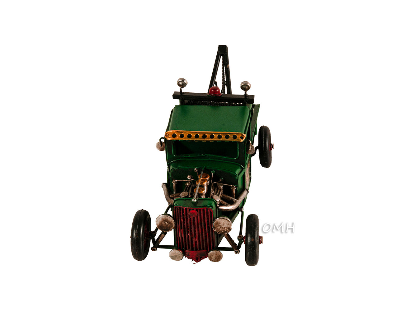 Necessity is the mother of invention, as Ernest Holmes Sr., of Chattanooga, Tennessee found in 1916 when he had to use ropes, blocks, and six men to pull a car out from a creek. Two years later, he patented the first ever tow truck. Our vintage Truck & Trailer tow truck model from Muncie, Indiana is expertly handmade out of metal and stands at 5.25 inches high and 12 inches wide. Its intricate details include rolling wheels, exposed engine compartment, crane system, chains, front grill, headlights, side mirrors, taillights, and more. Gorgeous retro coloring and a Truck & Trailer logo on the doors completes the look of the era.