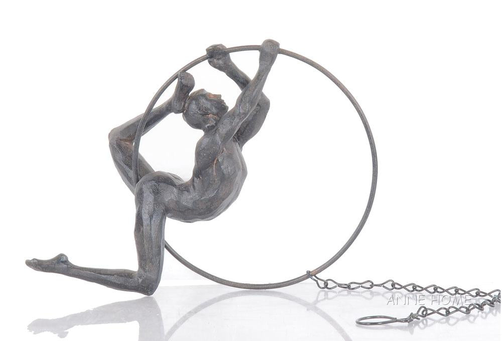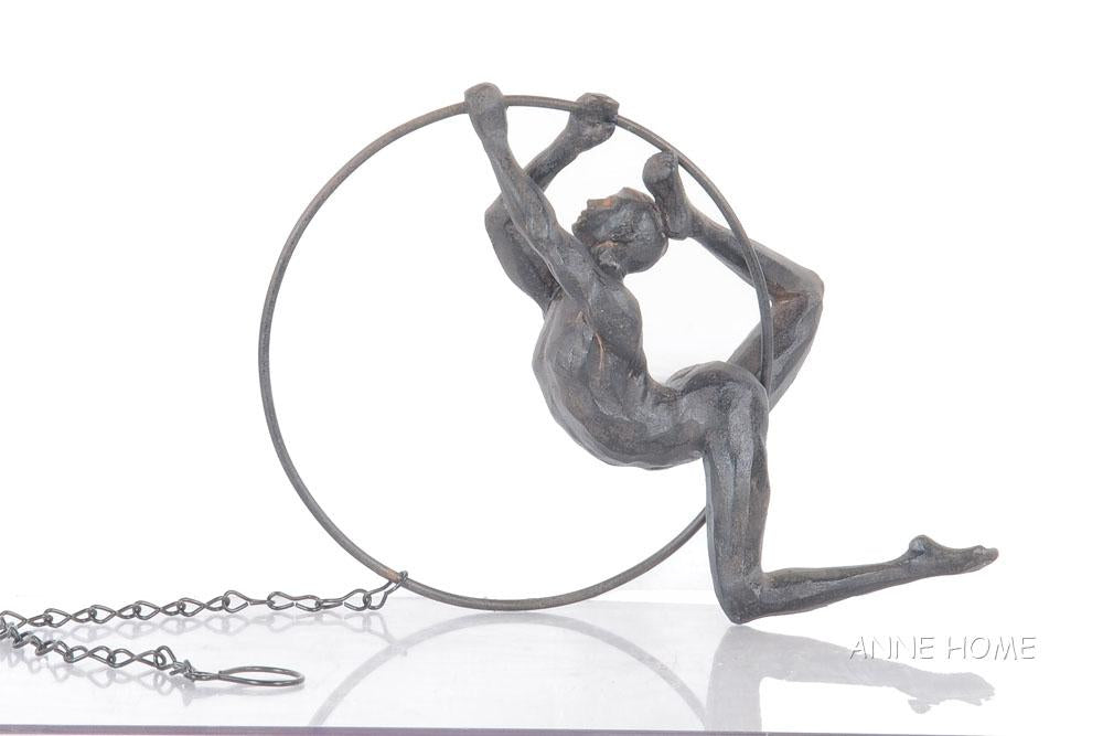 A ring man represents ultimate strength and flexibility. This decorative piece is best hung from the ceiling or at a higher point to showcase the essence of athleticism. This piece is all black with some copper touches for a realistic look. This would make a great addition anywhere in your home or office with its subtleness.