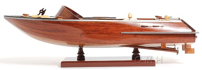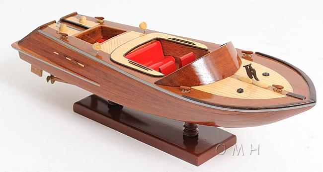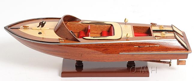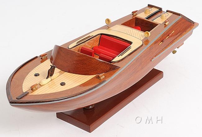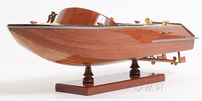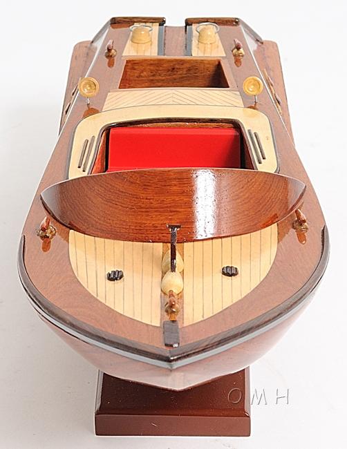 Our Runabout Canoe is filled with details and ornaments that are handcrafted from various high-quality wood such as mahogany and exotic local woods. On this model, you can locate the beautiful crafted wooden and metal knick-knacks such as steering wheel, seats, lights, canoe propeller, and many more. This model is completely hand built by skillful and creative master craftsmen, you will be amazed at how real it looks. The Runabout Canoe model was built according to scale through original plans, pictures and drawings (1:12). The model sits on a wooden stand and is ready to be display. This model is shipped fully assembled.
