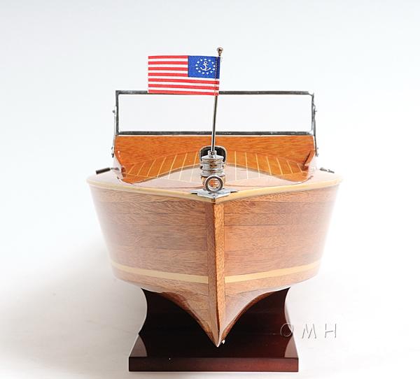 Our Chris Craft Runabout model was handcrafted from mahogany & western red cedar. The hull was constructed using plank on frame method. Each strip of exotic wood was carefully joined together. This model was completely hand built to spec by skillful and creative master craftsmen. You will be amazed at how real it looks. On the ship, you will find a variety of beautiful handcrafted brass fittings such as: front windshield frame, ring gauges, steering wheel, horns, lights, propeller, flag pole and many more. The leather seatings were carefully stitched like real. This model comes with a detachable wooden stand and is ready for display.