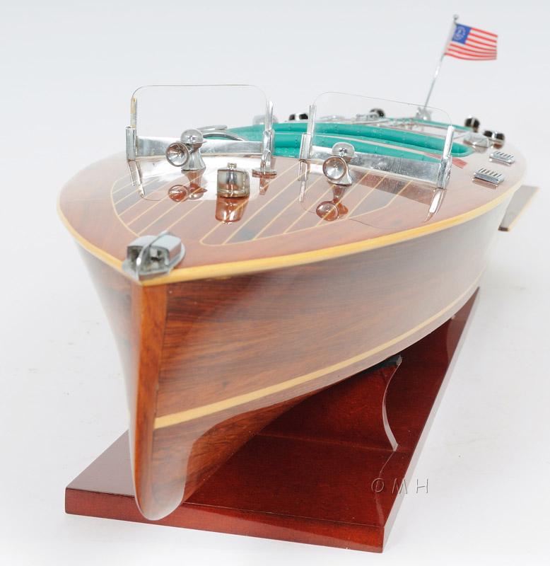 This is a beautiful 100% handcrafted mahogany Chris Craft model. It take hundreds of hours to build by skillful and creative master craftsmen. Contains hundreds of beautiful details such as shiny chrome and brass fittings, very detailed dashboard and leather seats. Layers of vanishes are applied; the hull is then smoothly sanded between coats to create a mirror effect. This model was built according to scale through original plans, pictures and drawings. Extensive research thru original plans and pictures makes our model look authentic. Each model goes thru a demanding quality control process before leaving our workshop. Rested in a neat wood stand. Model shipped fully assembled. This item is just as luxurious as the real boat.