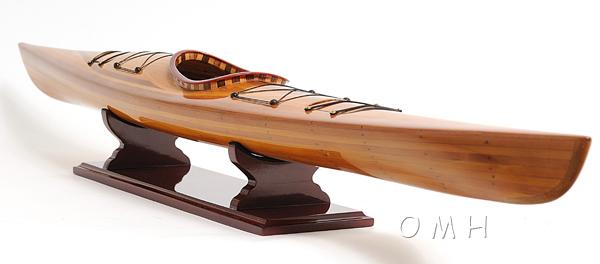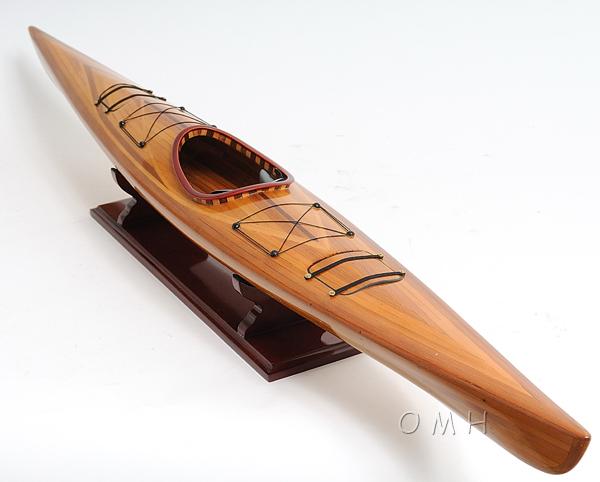 The true kayaking enthusiast will absolutely adore this one-of-a-kind model, built using the same techniques as our craftsman use on life-size versions. Hours upon hours have gone into its construction as they have simulated historical drawings and diagrams. No detail is spared in these models. The rich cedar wood and even the cover and straps on the hatches make this model truly come alive. Displayed in any home or office setting, this piece will certainly be a showstopper, as people stop and admire the attention to detail and obvious craftsmanship that when into its construction.