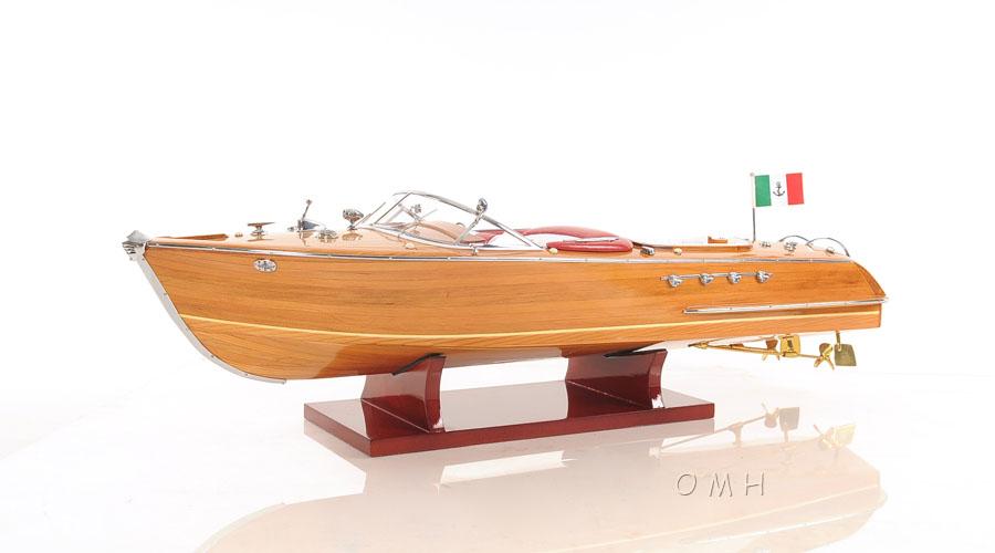 The Riva Aquarama was designed by Carlo Riva in the 1960s. The Riva is noted as one of the most legendary and famous speedboats out there. It is available as a FULLY ASSEMBLED model ready to be proudly display as a piece of history. Master craftsmen handcraft these highly detailed wood models from scratch using historical photographs, drawings and original plan. They are built to scale with high-grade wood such as: western red cedar, rosewood, and mahogany. They are 100% hand built individually using plank-on-frame construction method and are similar to the building of actual ships. Each model requires hundreds of hours to finish and must go through a demanding quality control process before leaving the workshop. This is truly beautiful model of the Riva Aquarama with western red cedar and mahogany hull. There are multiple tones of wood decking on the bow. You can find exquisite details from the leather works to all the realistic gauges. All fittings such as windshield frame, wiper, navigation lights, mirror, flag pole are made of stainless steel. The cockpit has two hand stitched individual leather seats as well as a rear passenger seat. The swimming platform also comes with stainless steel hand rails. The model rests on a wooden stand for easy display.