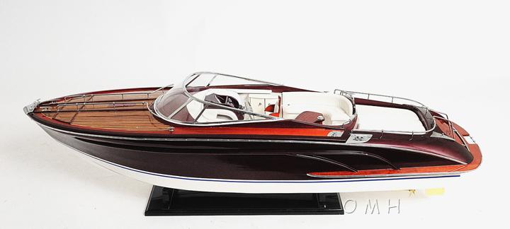 This is an exclusive edition of the Riva Rivarama, where the model is uniquely identified by a laser cut hull serial number. Our luxurious Riva Rivarama model is handcrafted from beautiful wood such as rosewood, mahogany, teak, and exclusively purple heart. The hull is constructed using a plank on frame method, each strip of exotic wood are carefully join together to form a smooth hull. This model is completely hand built to spec by skillful and creative master craftsmen; you will be amazed at how real it looks. The ship has a lustrous color of white and black follow with amazing details. You can easily spot the eye-catching details such as: all white leather seats, wooden coffee table, wooden cabinet, colorful navigation gauges, shiny metal steering wheel, metal horns, metal rails surrounding the boat, clear windshield with metal frames, painted black and white interior and much more. All these detailed ornaments contribute to an astounding wooden Riva Rivarama. In addition, a detachable wooden stand comes standard with this model. Our model was built according to scale through original plans, pictures and drawings. We absolutely use no plastic parts only the highest quality wood and metal parts. This model is carefully packed with 2 thick layers of Styrofoam for damaged free shipping purposes. Our Riva Rivarama model comes ready to be display.