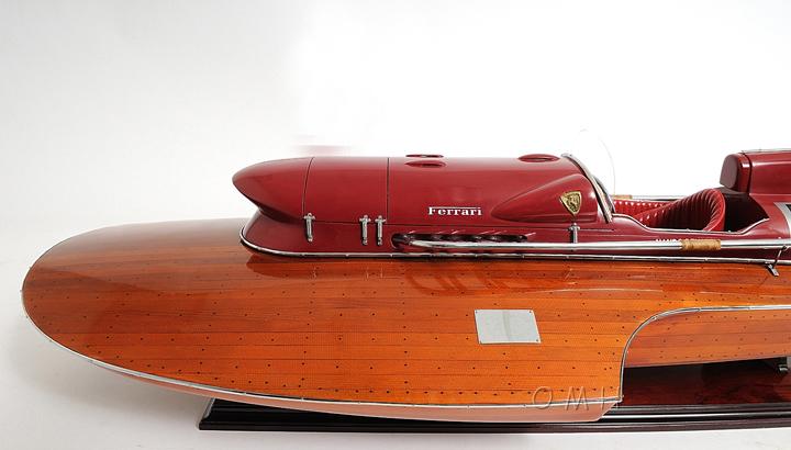 On the morning of October 15, 1953, Achille Castoldi succeeded in smashing the 800kg class speed record with an average “flying kilometer” two-way speed of 150.49 mph on this Ferrari hydroplane. Now you can recreate this stunning race by installing RC system for this model. Master craftsmen handcraft these highly detailed wood models from scratch using historical photographs, drawings and original plan. They are built to scale with high-grade wood such as: western red cedar, rosewood, and mahogany. They are 100% hand built individually using plank-on-frame construction method and are similar to the building of actual ships. Each model requires hundreds of hours to finish and must go through a demanding quality control process before leaving the workshop. This is an amazing model of the Ferrari Hydroplane handcrafted from cedar and mahogany. The hull is encapsulated in one layer of fiberglass from both inside and outside for extra reinforcement and water proof. Under the painted red hood, there is plenty of space for installing RC system. There are hundreds of tiny construction nails vividly showed on the hull. The dashboard has two tones wood panel installed with realistic look stainless steel gauges. The cockpit has a hand stitched red leather seat, a big stainless steel steering wheel and copper pedals. Two large stainless steel exhausts are coming out from the V12 engine compartment one on each side. Shiny stainless steel ruder, prop shafts and propeller are uninstalled but included. The light wood trim around the boat completes the decoration of this gorgeous model. This model is secured on a removable large wood base for display when not racing. Engine compartment specification: Rectangular area dimension: Max Length: 15.75 inches Max Width: 2 inches Max height: 4.25 inches Pentagon area dimension: Max Length: 4.625 inches Max Width: 2.125 inches Max height: 1.75 inches