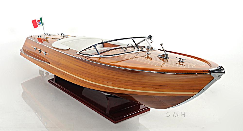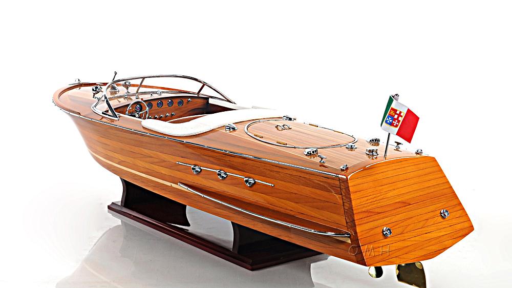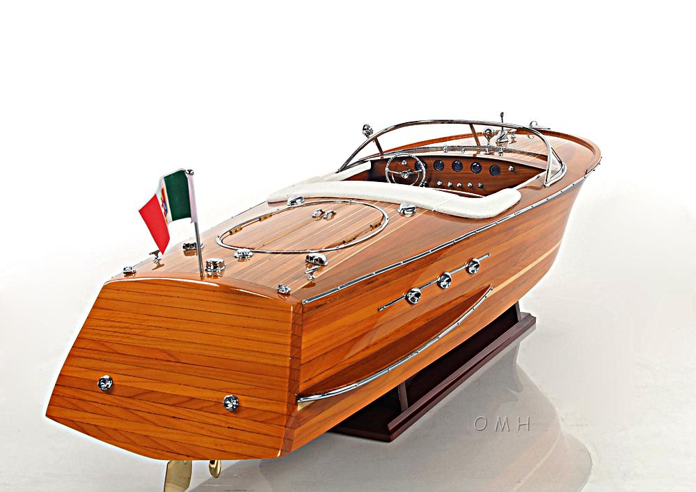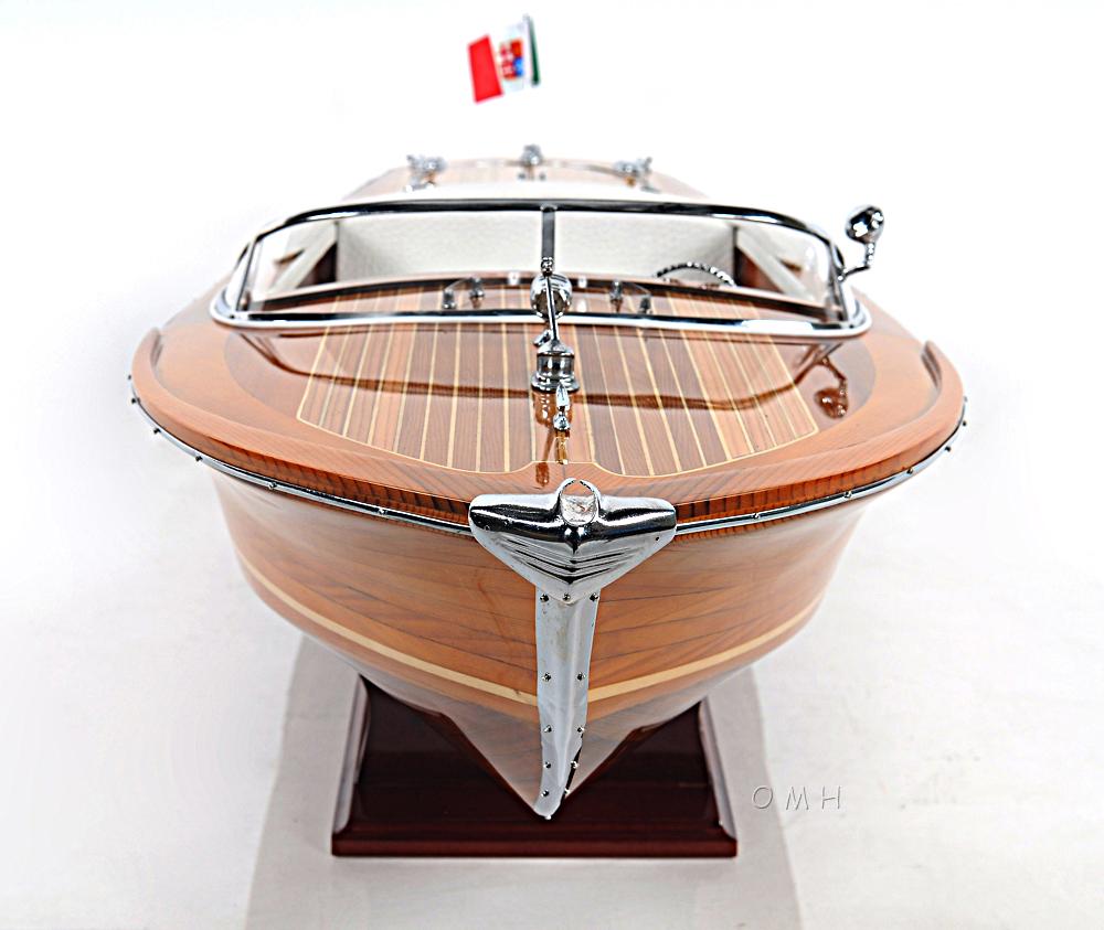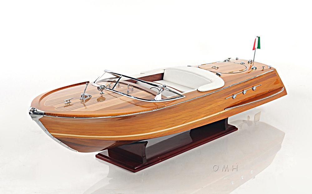 This is an exclusive edition of the Riva Ariston, where the model is uniquely identified by a laser cut hull serial number. Our luxurious Riva Ariston model is handcrafted from beautiful wood such as rosewood, mahogany, teak, and along with various other exotic wood. The hull is constructed using a plank on frame method, each strip of exotic wood are carefully join together to form a smooth hull. This model is completely hand built to spec by skillful and creative master craftsmen; you will be amazed at how real it looks. The ship has a lustrous color of white and varnished red wood on the side of the hull. On the top, you can spot gorgeous glossed red and natural wood trims along with others amazing details. You can easily discover the eye-catching details such as: all white leather seats, colorful navigation gauges, shiny metal steering wheel, metal horns, metal control consoles, metal rails surrounding the boat, clear windshield with metal frames, unique storage space with opening/closing doors and much more. All these designs and detailed ornaments and chrome brass fittings contribute to the luxurious wooden Riva Ariston. In addition, a detachable wooden stand comes standard with this model. Our model was built according to scale through original plans, pictures and drawings. This model is carefully packed with 2 thick layers of Styrofoam for damaged free shipping purposes. Our Riva Ariston model comes ready to be display.