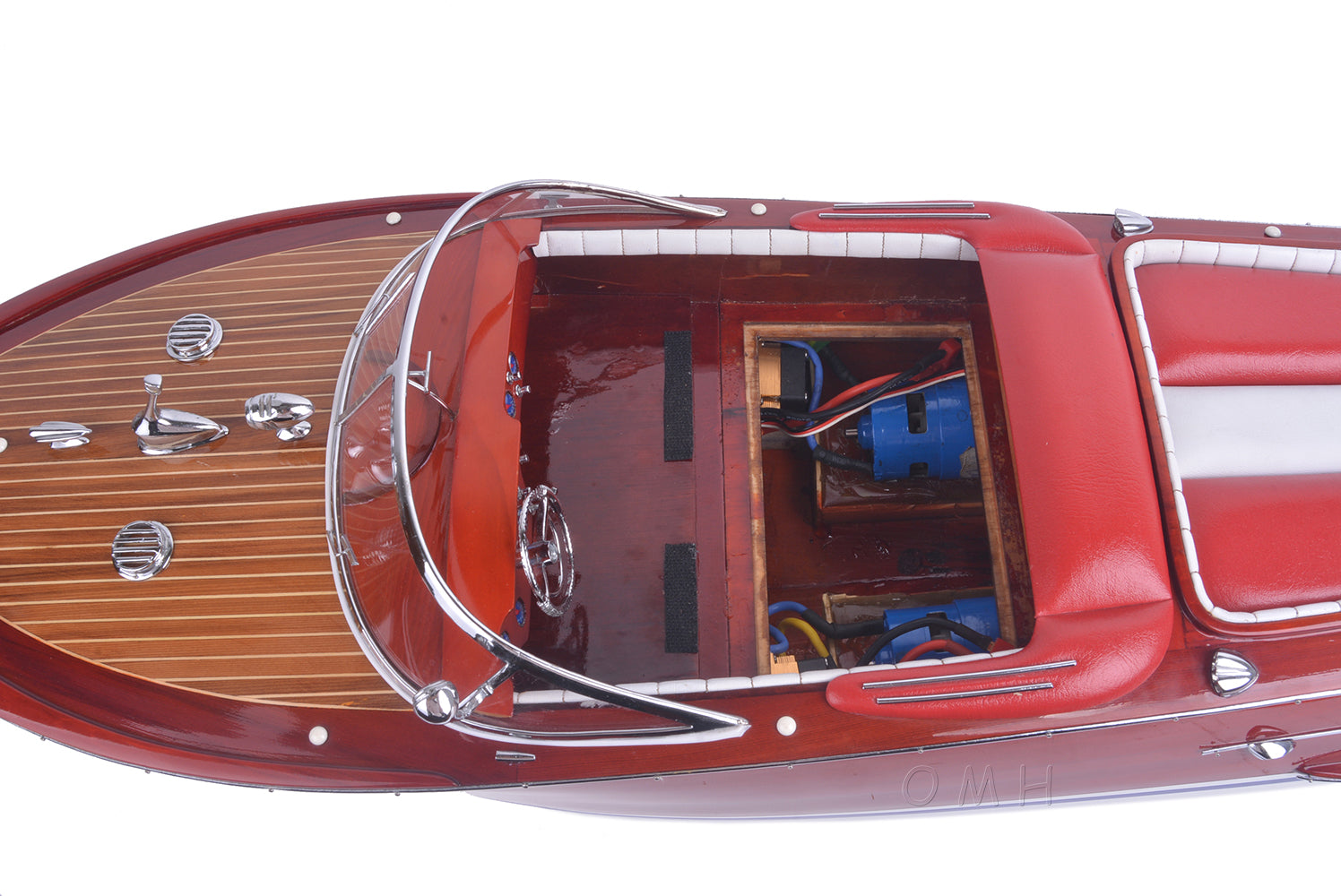 The Riva Aquarama was designed by Carlo Riva in the 1960s. The Riva is noted as one of the most legendary and famous speedboats out there. Now you can experience the power through the RC dual electric motors! This stunning Riva Aquarama comes with a full RC system along with all the necessary components to thrust it in water up to 15mph! Over 800 of these boats were built and had 5 different variations. One of these variations was built in collaboration and for Lamborghini. This RC model features an elegantly bright red body with white and chrome accents. Power is generated through the double 775 brushed motors and is outputted through two aluminum propellers. The RC boat also features two electronic speed controllers one per motor and comes out of the box with everything needed to operate it. Included with the boat are two rechargeable batteries wired to deans, charger, balancer, and the remote everything to get it running straight out the box. Specifications: Length: 35 Inches Width: 10 Inches Height: 9.5 Inches Motor: Double - 775 brushed motor ESC: Double – 480A brushed Radio: 2.4GHz advanced radio control system. Propeller: Double - Aluminum Prop 4.75mm Shaft 2 Blade 40mm Battery: Double - Lipo XF-Model 3S 1500mAh 25C Charger: Double - B3 Pro charger Speed: 9-15 mph Click HERE to view the Riva RC in action! Click HERE to download the Riva RC owner's manual