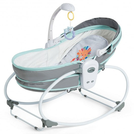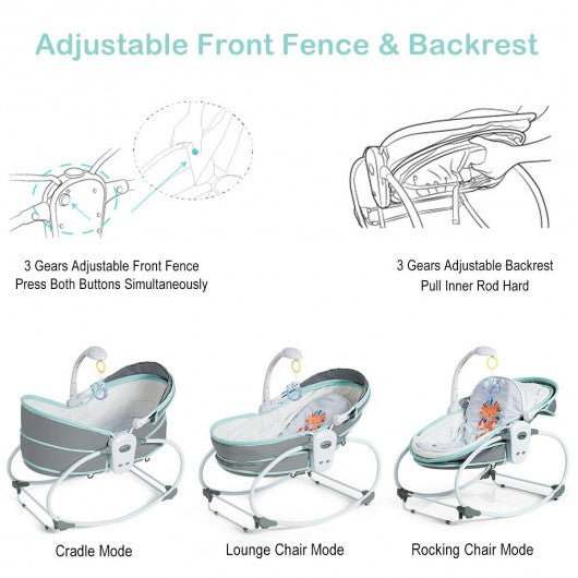 This is the 5-in-1 crib which is both practical and fashionable making it ideal for 0-3 years old growing babies. The crib is designed to create a comfortable and warm sleeping atmosphere for your baby. It has 5 different modes of cradle lounge chair rocking chair travel basket and bed in bed to suit different needs. You can set it to bed in bed mode so that you can check your baby's condition on the adult bed at any time. You can also disassemble it into a separate travel basket for easy carrying. The strong bed board and soft removable mattress protect the baby's spine. And the detachable awning is equipped to let the baby fall asleep quickly. The front fence and backrest can be easily adjusted to the most comfortable position for your baby. Interesting toy bar and music vibrating box can enlighten musical talent while soothing the baby. Multi-function cradle will be your ideal gift choice. 5-in-1 multi-function crib can be switched back and forth between 5 modes It can be used as a cradle lounge chair rocking chair travel basket or bed in bed Pull the pole to adjust the 3-level backrest and convert the bed into a recliner or seat 3-point cartoon seat belt can ensure safety 9 lullabies in the music vibrating box with 2-level volume adjustable Soothing vibration makes your baby fall asleep easier The detachable toy bar can be adjusted at a large angle and is equipped with a soft toy Adjustable and detachable canopy creates a quiet sleeping space for the baby Sturdy support feet allow the crib to switch between fixed mode and rocking mode You can adjust the front fence by simultaneously pressing the buttons on both sides of the crib Baby mattress is soft and durable protects your baby's soft skin The detachable and lightweight basket is ideal for traveling