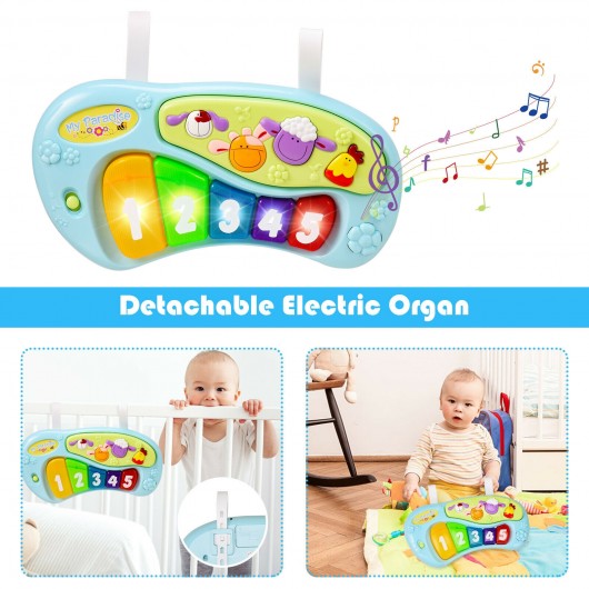 This baby jumperoo not only lets your baby jump but also allows you to do your own things! The removable and washable seat can swivel 360 degrees so that your little one is able to touch and play with all toys which enhance hand-eye coordination. In addition the detachable electric organ with different keys and sounds increases the ability of hearing and touch. Besides the detachable bottom platform can be adjusted to 3 different heights to grow with your little one. The ASTM certification offers the best protection for your adorable baby. And the smooth surface ensures extra safety. Don't hesitate to buy it? Accesses all toys with 360 degrees rotating seat Seat can be removed and washed for great convenience Offers comfortable seating experience with soft and non-toxic material Grows with your little one with 3 adjustable heights Allows your baby to jump freely thanks to its large and detachable platform Enhances hand-eye coordination due to 5 different toys Removable electric organ with lights and multiple sounds can be hung on the cradle Provides the best protection with ASTM and CPSIA certification Bottom non-slip foot pads can effectively increase stability Quick installation with an easy-to-understand instruction Free your hands to do your own things