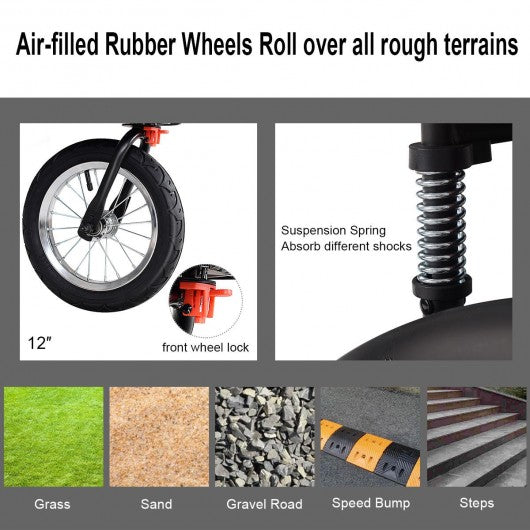 Specification: Color: Black/Gray Material: Iron + linen Net weight: 28 lbs Maximum allowable load: 55 lbs Maximum load of storage basket: 6.5 lbs Age range: 3-36 months Dimension: As pictures shown Front wheel size: 12" Rear wheel size: 16" Package includes: 1 x Baby stroller 1 x Mannual