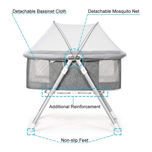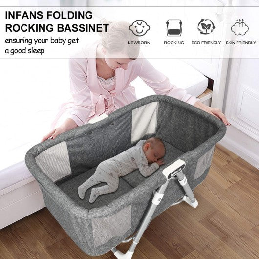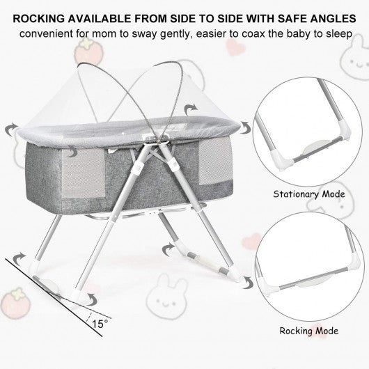 There is this new coming rocking bassinet for newborn and baby which has a wonderful 2 in 1 design. It is not only a travel cradle but also a portable crib. We use high strength aluminum alloy bracket as the main construction for our rocking bassinet which makes it safer and durable for long time daily use. And the bassinet is easy to fold with the portable design. The special arc leg design also makes our bassinet changeable into swing bed mode and sturdy bed mode according to your different needs. The baby bassinet include a scientific design that the breathable mesh is placed in four corners of the crib and your baby can breathe fresh air no matter which way his head is turned when he is sleeping. The detachable and washable fiber also makes it easy to clean and maintain. If you are looking for crib like that don't hesitate to buy it. One-second fold system 2 in 1 design meets different needs Side-to-side 15 degree safe swing angle Swing bed mode or sturdy bed mode available Non-slip foot design facilitates better placement of the crib Washable and detachable design for easily clean and maintain Removable mosquito nets protect the baby from mosquito bites Soft and thick sleeping mattress to offer comfortable use experience Zipper structure of mattress cover and outer cloth are easy to disassembly