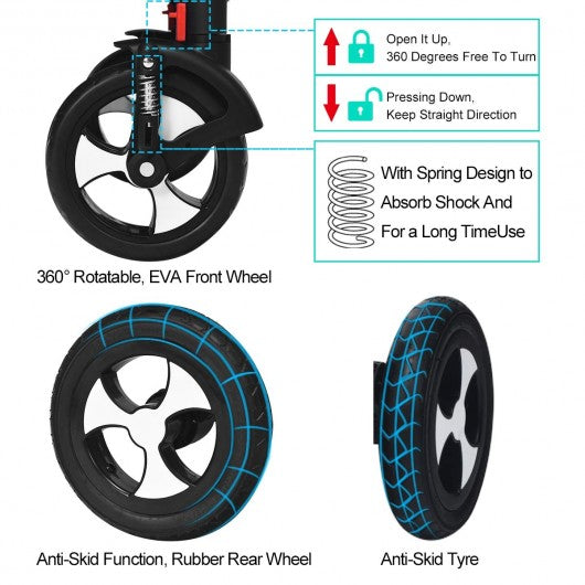 Specification: Material: Aluminum alloy (frame) + PP + EVA (front wheels) + rubber (rear wheels) Net weight: 21 lbs Gross weight: 24 lbs Suitable ages: 0-36months Weight capacity of seat: 33lbs Weight capacity of storage bag: 2 lbs Weight capacity of storage basket: 6.6 lbs Fold size: 34" x 24" x 9.5" ( L x W x H ) Product size: 32" x 24" x 43" ( L x W x H )