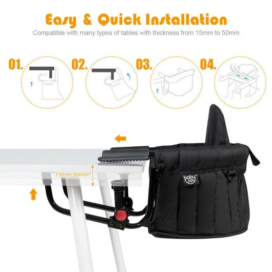 This fast hook on baby table chair is the perfect choice to fit your busy lifestyle. Made of solid iron pipe the table chair is of great firmness and strength which is supportive enough to hold your baby. Besides 2-point safety harness and tight fixing clip ensure baby's safety and prevent the baby from falling off the chair. The quality fabric is durable and can provide long service life. In addition the washable feature makes the cleaning process simple and convenient. The whole chair can fold to flat for easy storage and space-saving. Storage bags in the back can be used to store snacks paper towels and other items. This hook on table chair is a perfect solution for eating away from home! If you are looking for such product don't hesitate to buy it now! Iron pipe frame provides great firmness strength and support Strong structure and durable fabric ensure long lasting service time 2-point harness and tight fixing clip ensure baby's safety Compatible with many types of tables with thickness from 15 mm to 50 mm Folding design for easy storage and portability Removable fabric and backrest makes it easy to clean Large capacity storage pocket is perfect for snack diapers or feeders Ideal for parents to enjoy self meal time without worrying about baby ASTM certification ensures safety and high quality