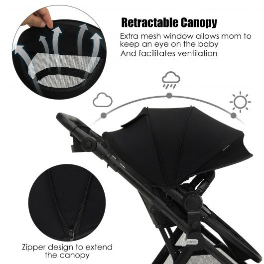 This high landscape baby stroller---Mommy's ideal helper! The reversible seat with 5-point buckles enables the stroller to have front and rear-facing positions along with a 3-level reclining angle for the backrest and even the most active babies can find their most cozy postures. Front wheels are responsible for smoothing rotating and also designed for fixed orientation if necessary and the back casters take credit for the foot-activated locking system. Packing a one-step fold system cup holder big storage basket and retractable canopy this baby stroller well knows what city life needs. Made of aluminum this baby stroller is your reliable choice. The retractable canopy has a top breathable window for ventilation Reversible seat with 3-level adjusting backrest Seat can be converted to let your baby face you or enjoy outdoor scenes Features 5-point safety belt lifting handle cup holder big storage basket detachable protective rail Adjust the angle of the push handle for people with different heights to use Convenient folding design with a lightweight for easy transportation and storage The front wheels can rotate 360 degrees or travel in a fixed direction Back casters are shock-reducing with foot stepping brake for all terrains The aluminum frame is stable and reliable with a weight capacity of 33 lbs It is ASTM and CPSIA certified and is the perfect gift for babies 6-36 months High landscape design avoids automobile emission and improves visual site