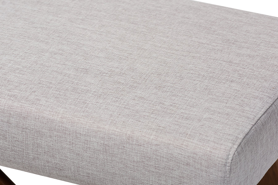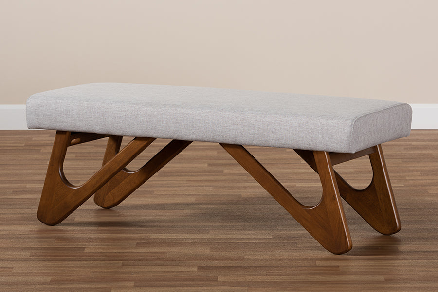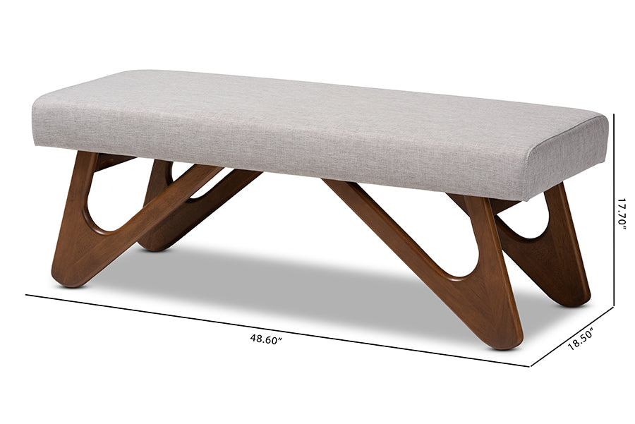 Baxton Studio Rika Mid-Century Modern Greyish Beige Fabric Upholstered Walnut Brown Finished Boomerang Bench