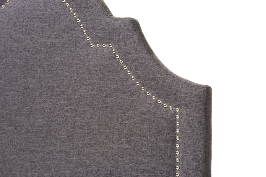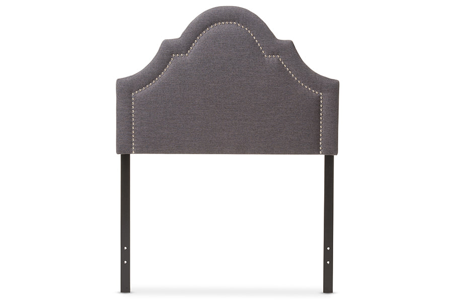 A combination of corners and curved lines come together to create this chic, modern headboard with a bit of vintage elegance. This show-stopping piece of furniture will bring your room to life. The Rita headboard comes upholstered in polyester fabric that is durable and strong. Each headboard is complimented by a contrasting accent of silver nail heads trim, which makes the color pop and gives a modern chic feel. Expertly upholstered, this adds an air of luxury to this quality headboard. Constructed of solid rubberwood frame and plywood, the headboard is built to last. Soft polyester fabric in dark grey tone over the foam filled headboard provides ample comfort for you to lean against. Leg supports are invisible once set up and can be adjusted to suit the height of your ensemble for convenience. Headboard sits between the wall and the ensemble frame, attaching not to the bed base but to the legs, for stability. Made in Malaysia, this twin size headboard requires assembly.