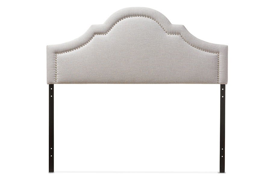 A combination of corners and curved lines come together to create this chic, modern headboard with a bit of vintage elegance. This show-stopping piece of furniture will bring your room to life. The Rita headboard comes upholstered in polyester fabric that is durable and strong. Each headboard is complimented by a contrasting accent of silver nail heads trim, which makes the color pop and gives a modern chic feel. Expertly upholstered, this adds an air of luxury to this quality headboard. Constructed of solid rubberwood frame and plywood, the headboard is built to last. Soft polyester fabric in greyish beige over the foam filled headboard provides ample comfort for you to lean against. Leg supports are invisible once set up and can be adjusted to suit the height of your ensemble for convenience. Headboard sits between the wall and the ensemble frame, attaching not to the bed base but to the legs, for stability. Made in Malaysia, this queen size headboard requires assembly.