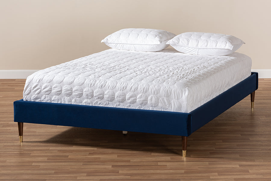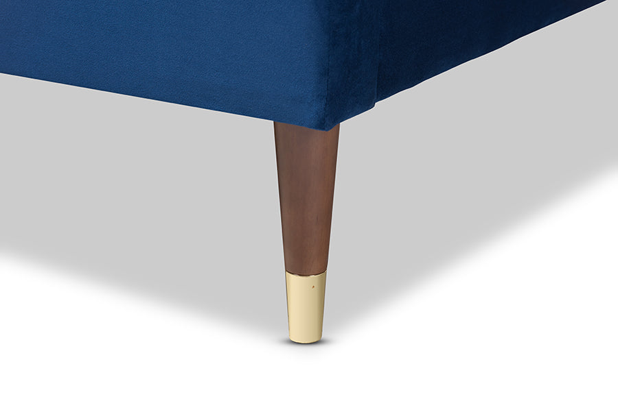 Baxton Studio Volden Glam and Luxe Navy Blue Velvet Fabric Upholstered Full Size Wood Platform Bed Frame with Gold-Tone Leg Tips
