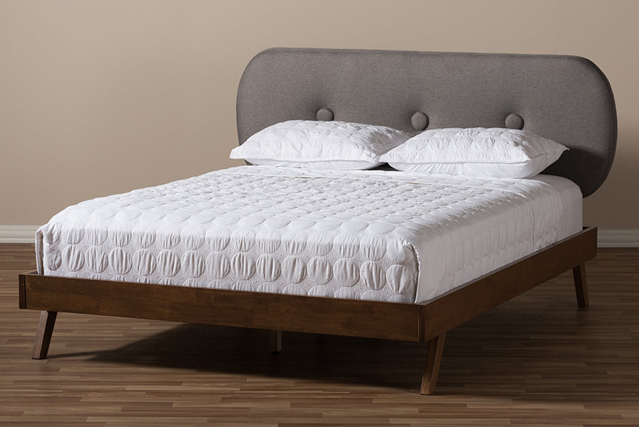 Baxton Studio Penelope Mid-Century Modern Solid Walnut Wood Grey Fabric Upholstered King Size Platform Bed