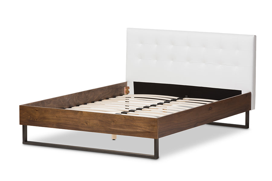 Baxton Studio Mitchell Rustic Industrial Walnut Wood White Faux Leather Dark Bronze Metal King Size Platform Bed