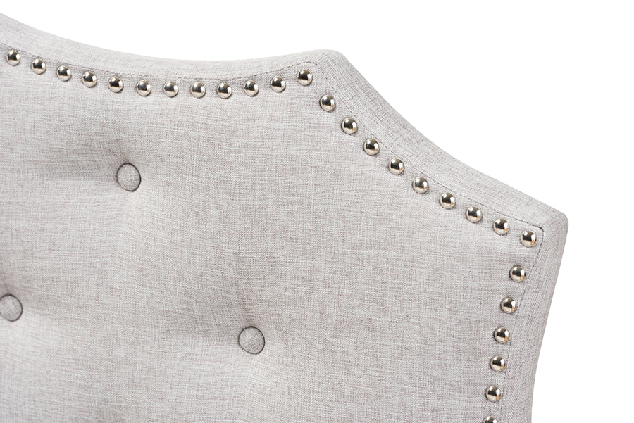 Classic finishes and an elegant curved shape make the Aurora fabric upholstered headboard the perfect centerpiece in your bedroom or guest room. Constructed of solid rubberwood frame, the Aurora headboard is upholstered in greyish beige or dark grey polyester fabric that is durable. Featuring curvaceous style lines with button-tufted design, the Aurora is glamorously trimmed with silver nail heads. The headboard is supported sturdily by solid wood posts and is exceptionally cushioned to provide softness and shape while you sit up. Made in Malaysia, the headboard requires assembly.