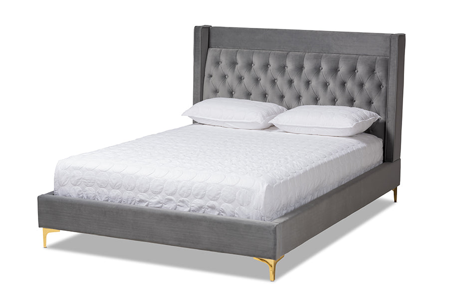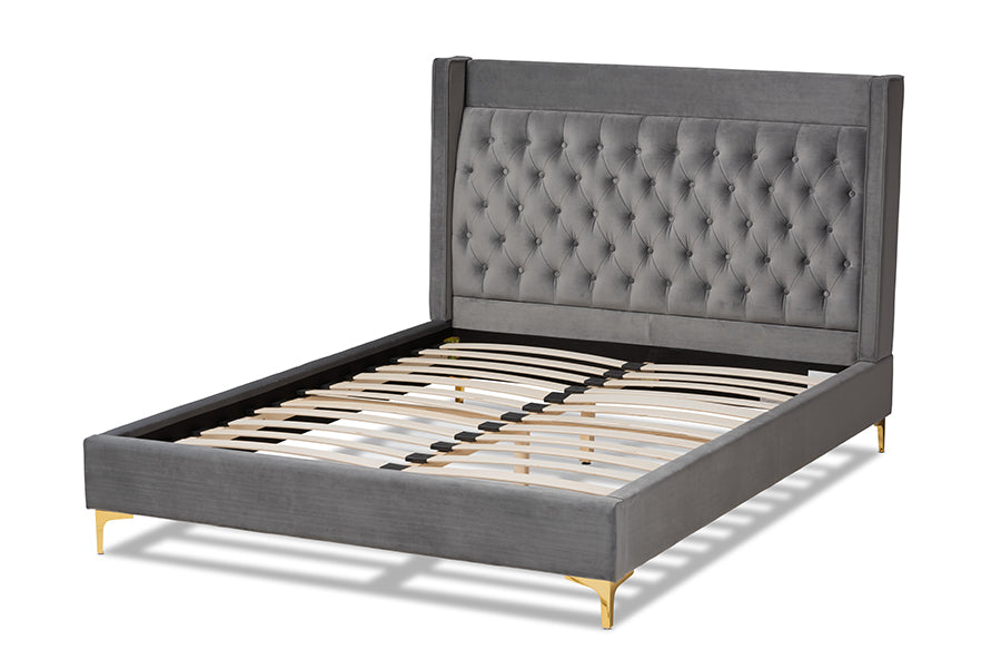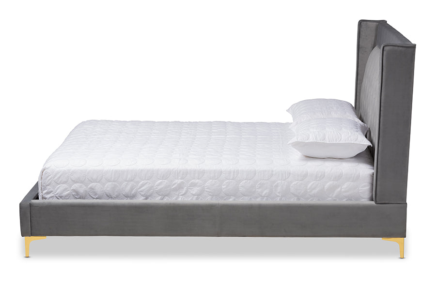 Baxton Studio Valery Modern and Contemporary Dark Gray Velvet Fabric Upholstered King Size Platform Bed with Gold-Finished Legs