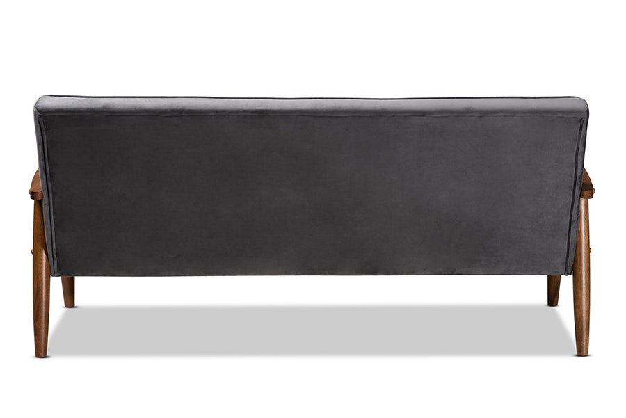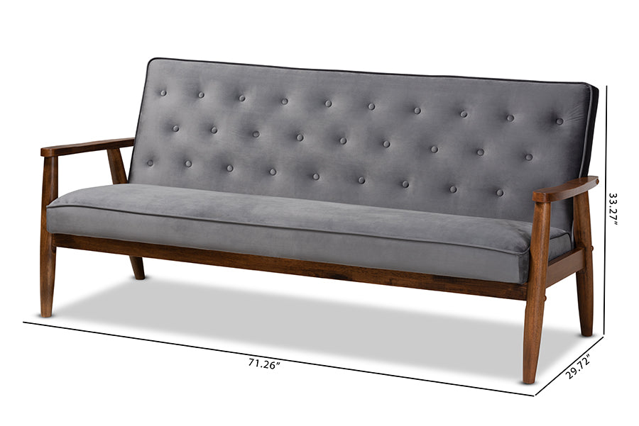 Baxton Studio Sorrento Mid-century Modern Grey Velvet Fabric Upholstered Walnut Finished Wooden 3-seater Sofa