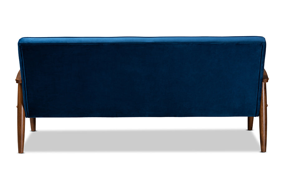 Baxton Studio Sorrento Mid-century Modern Navy Blue Velvet Fabric Upholstered Walnut Finished Wooden 3-seater Sofa