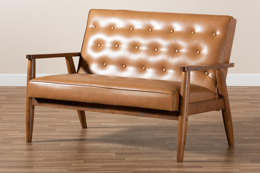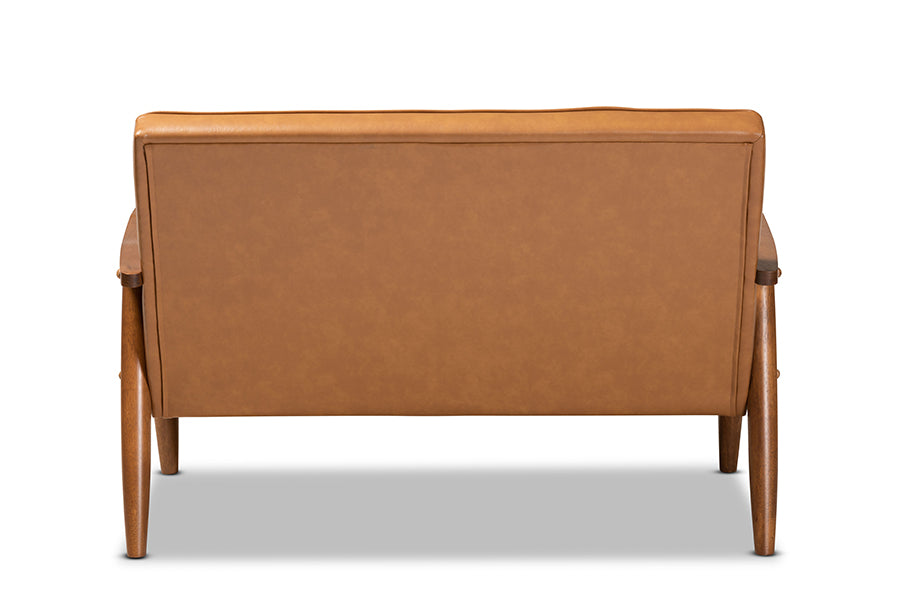 Baxton Studio Sorrento Mid-Century Modern Tan Faux Leather Upholstered and Walnut Brown Finished Wood Loveseat
