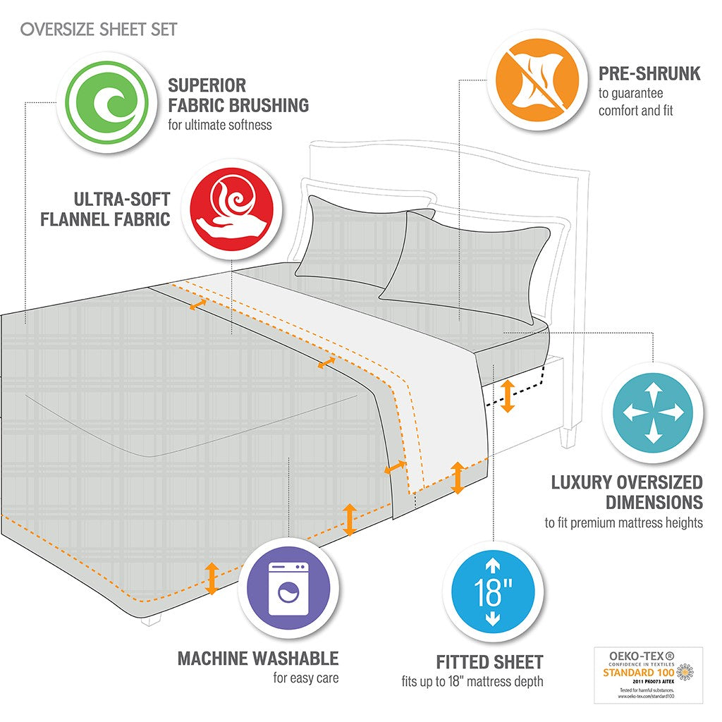 Sleep in warm and ultra-soft comfort with the Beautyrest Oversized Flannel Cotton Sheet 4 Piece Set. This flannel sheet set features superior brushed fabric for incredible softness and oversized dimensions to fit premium mattresses. Pre-shrunk for guaranteed comfort and a secure fit. This sheet set is also OEKO-TEX certified, meaning it does not contain any harmful substances or chemicals to ensure quality comfort and wellness.