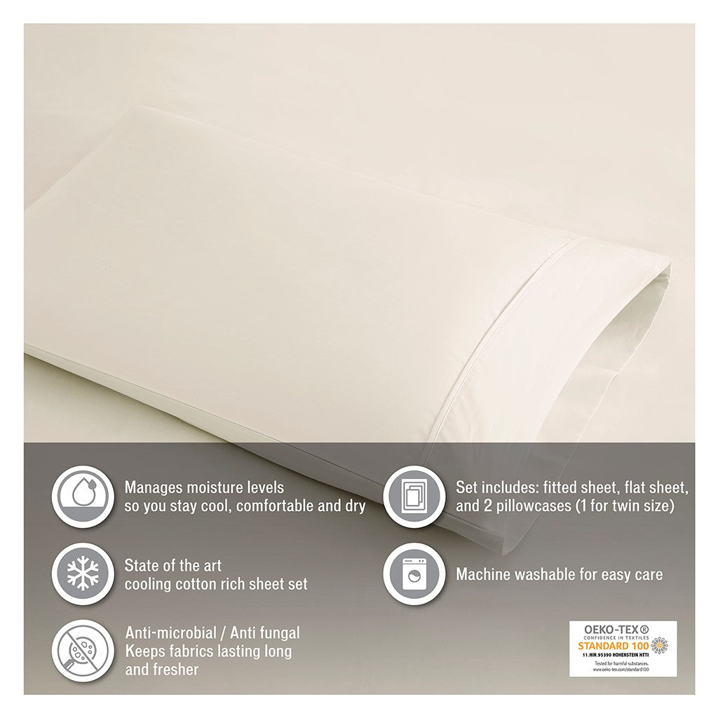Stay cool throughout the night with the Beautyrest 600 Thread Count Cooling Cotton Rich Sheet Set. This cotton sateen sheet set features state of the art cooling treatment that manages moisture levels so you stay cool, comfortable, and dry. Made from 60% cotton and 40% polyester blend, this 600 thread count sheet set is machine washable for easy care and provides a durably soft look and feel. The fitted sheet features elastic fully around the edge fits up 18-inch mattress depth. These cotton rich sheets also have an antimicrobial treatment for health and wellness - kills and prevents bacteria buildup, helps reduce odors, and enhances hygiene. These cotton sheets are also OEKO-TEX certified, meaning it does not contain any harmful substances or chemicals, ensuring quality comfort and wellness.