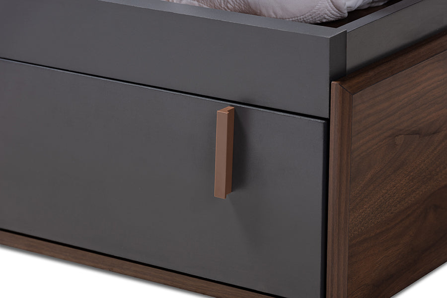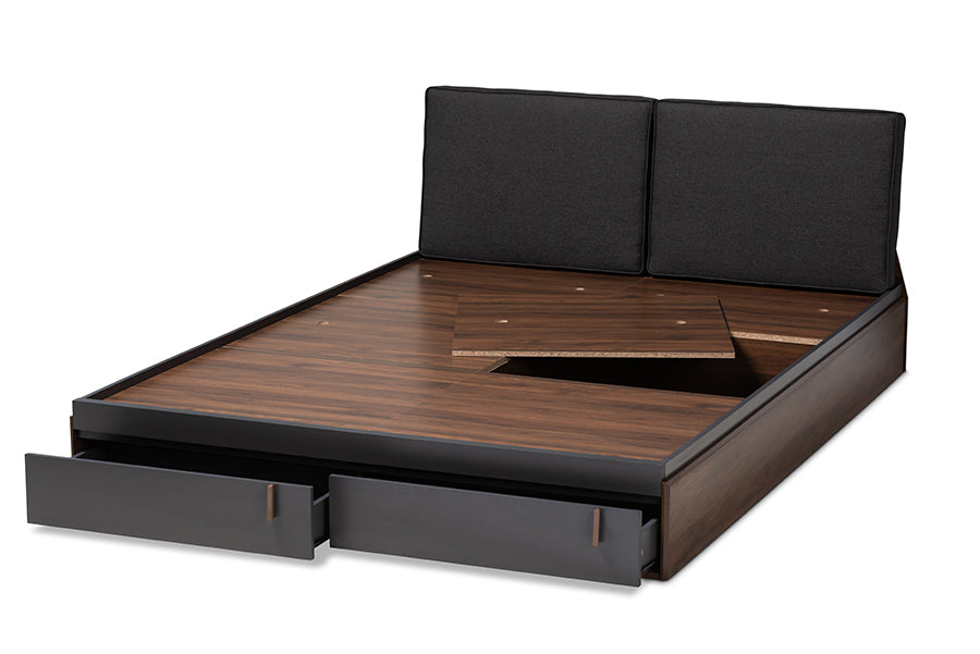 Baxton Studio Rikke Modern and Contemporary Two-Tone Gray and Walnut Finished Wood Queen Size Platform Storage Bed with Gray Fabric Upholstered Headboard