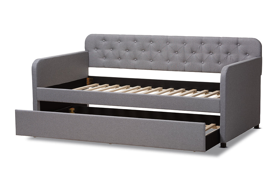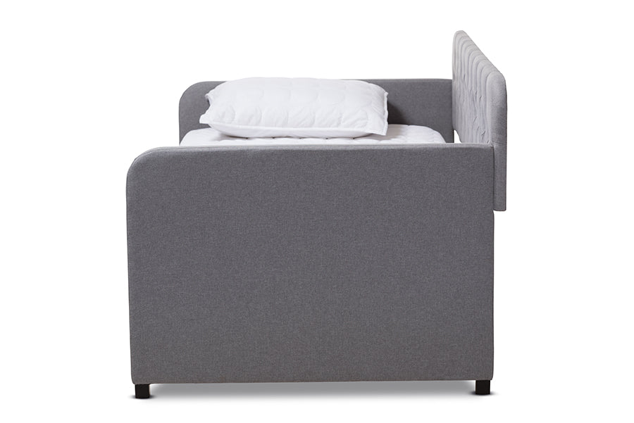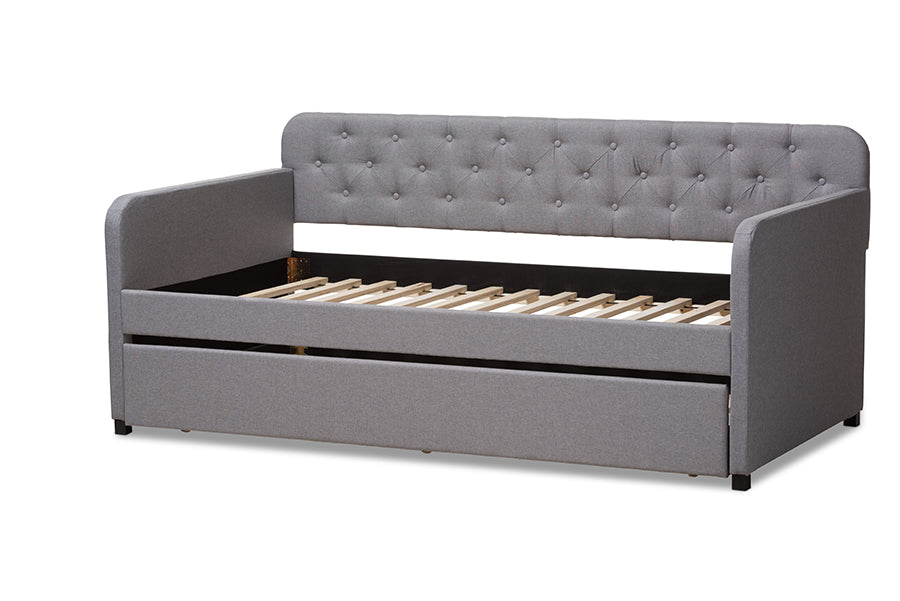 Baxton Studio Camelia Modern and Contemporary Grey Fabric Upholstered Button-Tufted Twin Size Sofa Daybed with Roll-Out Trundle Guest Bed