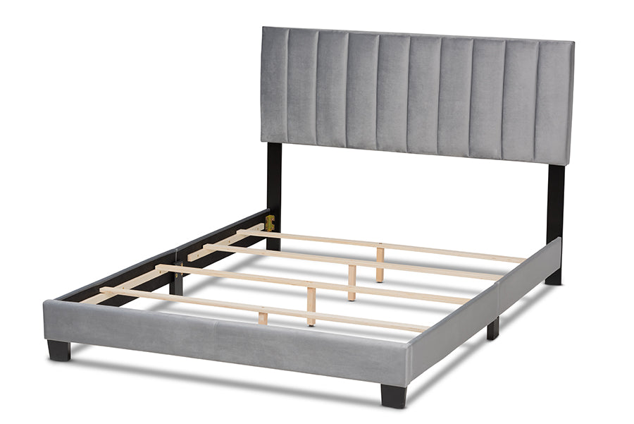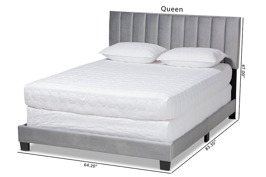 Baxton Studio Clare Glam and Luxe Grey Velvet Fabric Upholstered Queen Size Panel Bed with Channel Tufted Headboard
